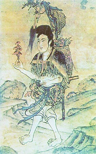 1974年,在山西应县佛宫寺木塔发现了一张古画(图1)(纵54厘米,横34.6厘米),图中人物,面部圆润丰腴 ,赤足裸腹,披着兽皮,围着叶裳,背着竹篓草帽,正手持灵芝匆匆行于山石之间,神态安详、平和、静谧。这幅画创作于辽代,画面中的神农氏女性特征极为明显。联想神农生活在母系氏族社会,辽人将其想象成一位氏族女王无可厚非。画中,在社农所负筐的下面有一根起支撑作用的木棍。这种背筐方式,至今仍在四川山民中流传。