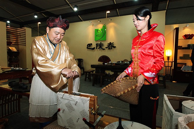 上图:紧压老巴陵黄茶制作表演把人们带进了遥远的古代