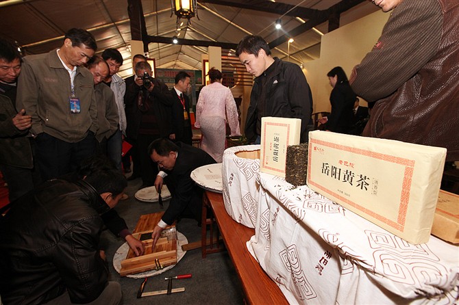我们现在向各位领导和贵宾表演的,是老巴陵黄茶仿古制作方法,采用岳阳本地小叶种茶为原料,演示最后一段工序--紧压成型。