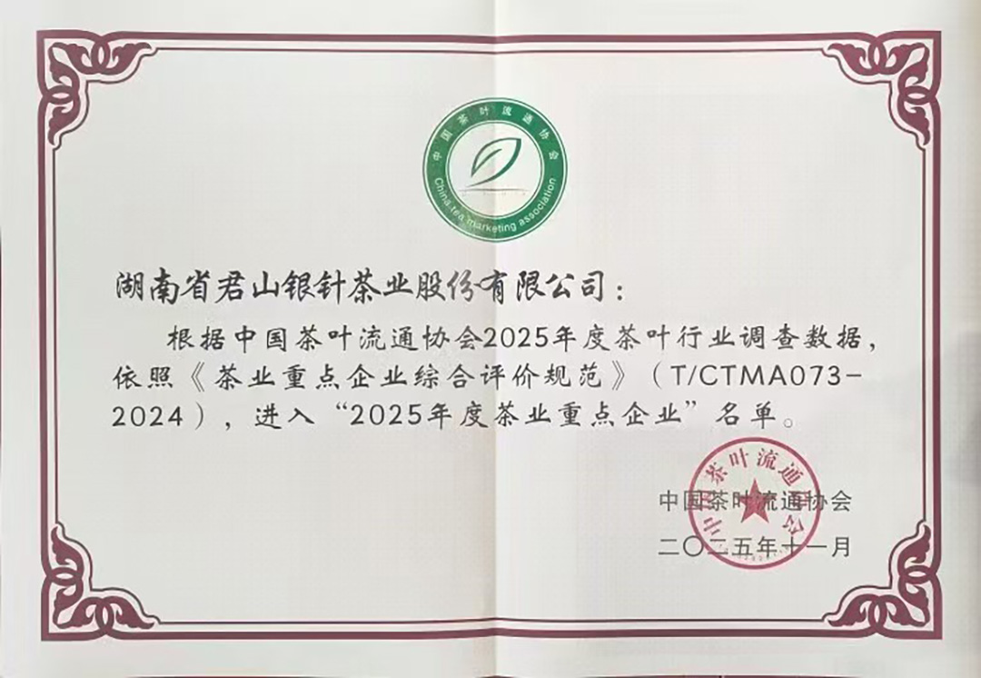 11月,湖南君山银针股份有限公司发挥龙头企业作用,被中国茶叶流通协会评为“2025年度茶业重点企业”。